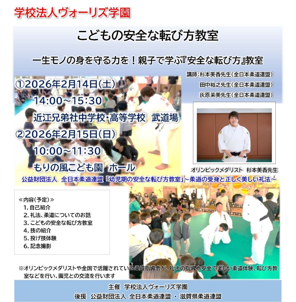 最近、お子様が転んだ時にうまく手が出ず、顔や頭に怪我をしてしまったことはありませんか? ヴォーリズ学園では、柔道の「受身」を応用して、一生モノの身を守る技術を親子で楽しく学ぶ体験会を開催いたします!