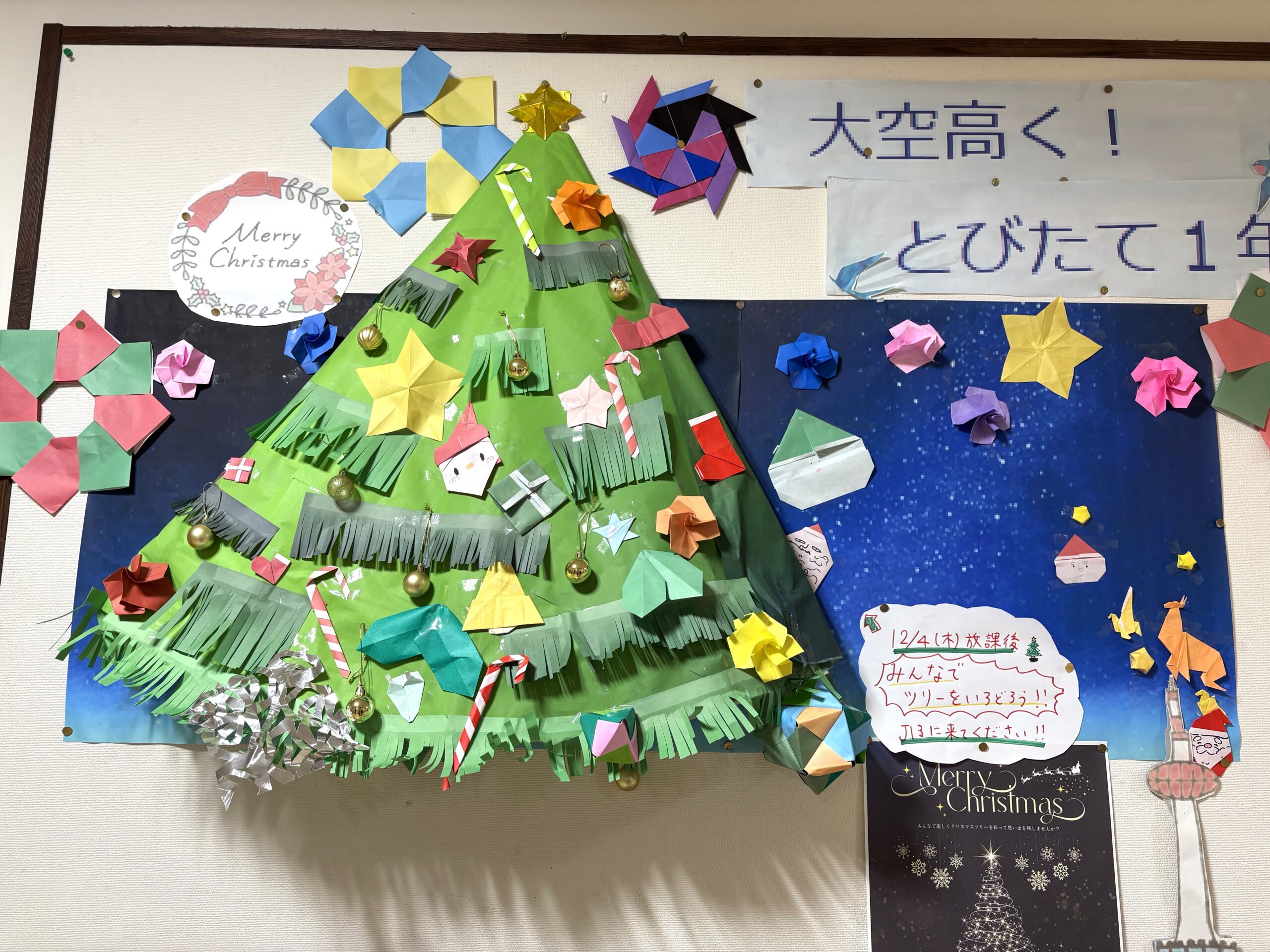放課後の時間を利用して1年生は廊下の掲示板にクリスマスツリー飾りつけました。 折り紙…