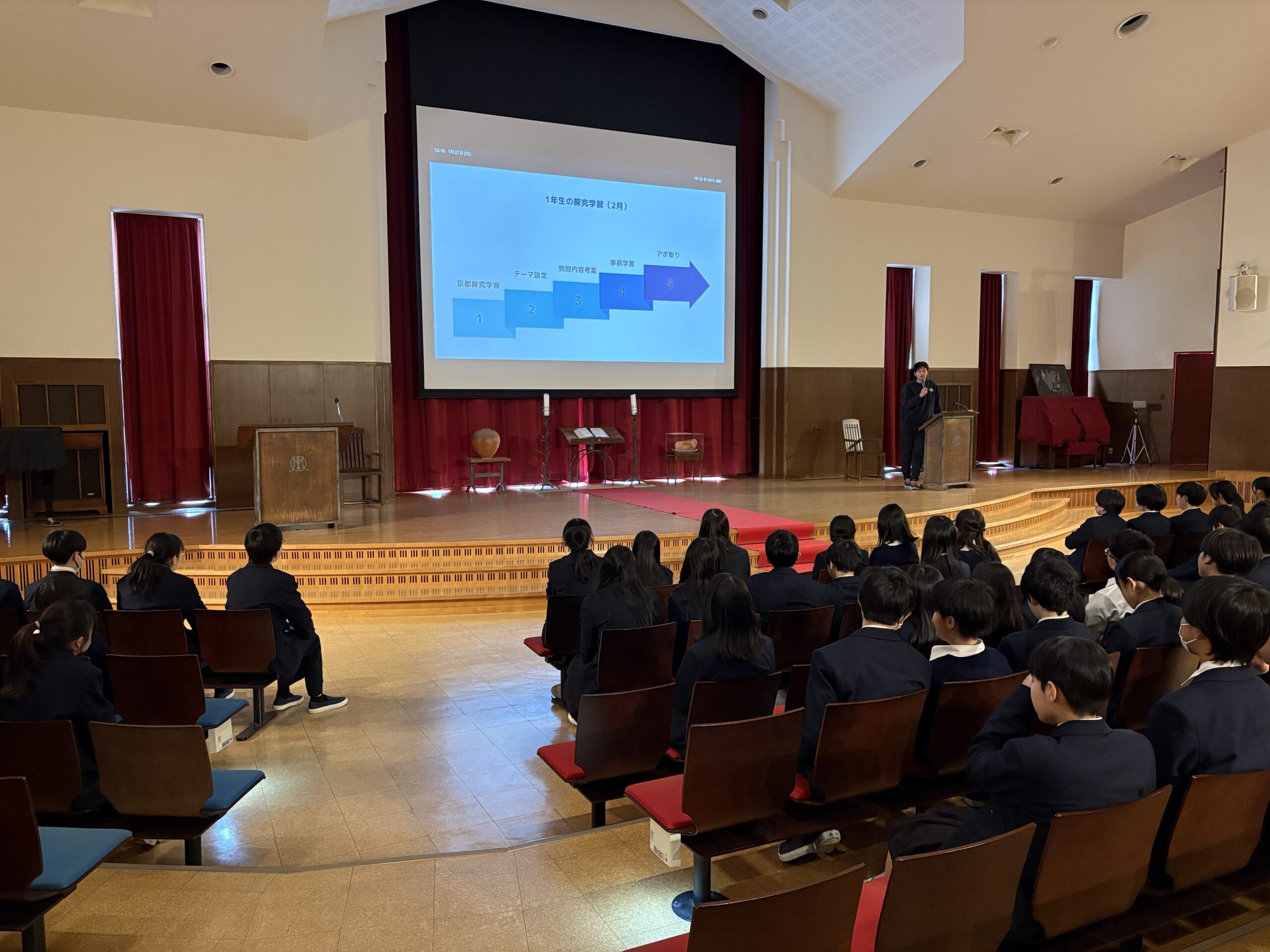1/27(火)、4時限に礼拝堂で学年LHRを行いました。今回は探究についての説明を聞…
