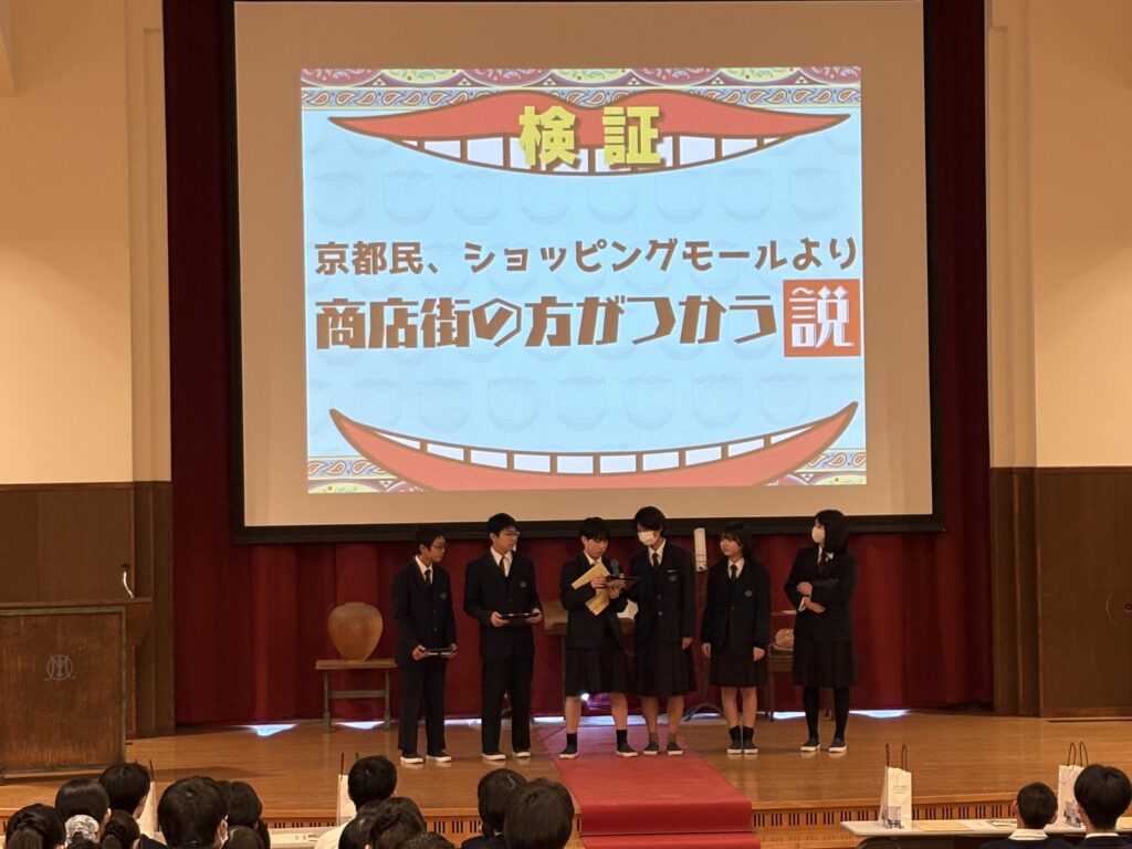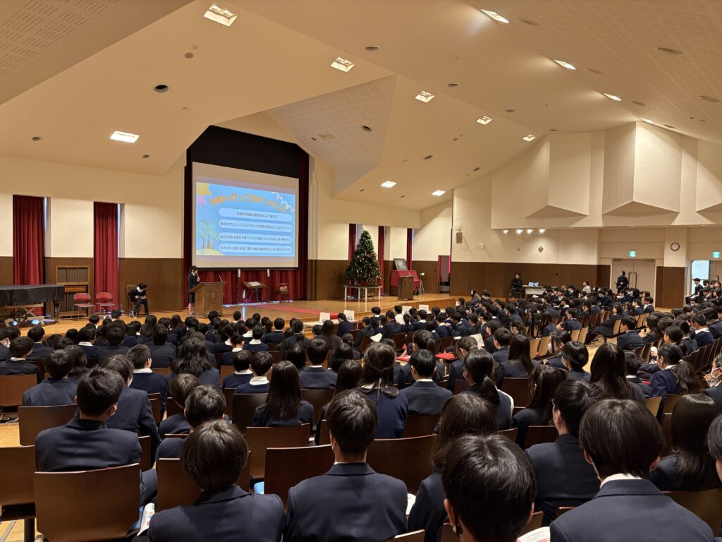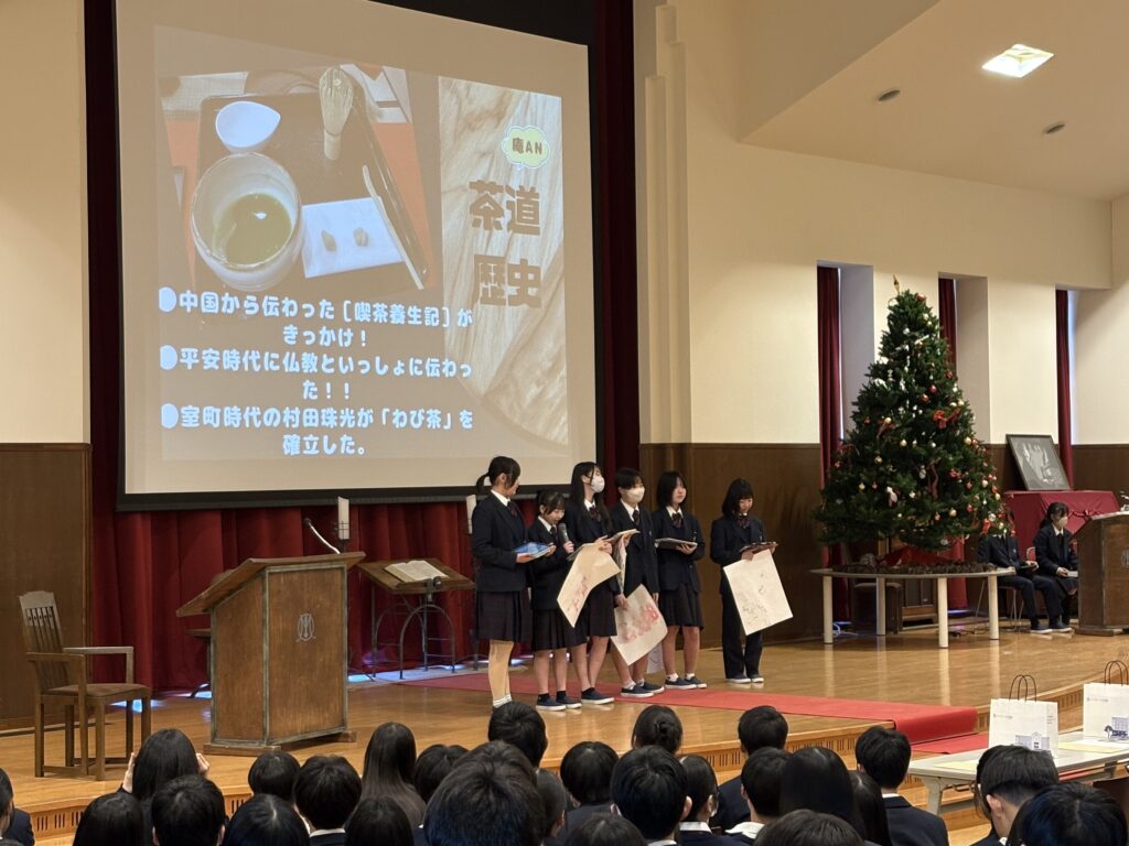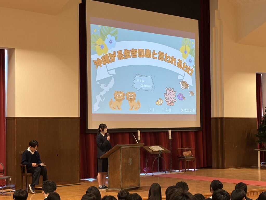 12月16日の午後、本校でIBLプロジェクトが行われました。 IBLプロジェクトとは各学年で今まで取り組んできた探究の集大成として、全校生徒の前で発表をするというものです。 今年度で2回目となる今回は前回よりもレベルアップしたものとなりました。 1年生は京都研修旅行で得た情報をもとに、「歴史」や「文化」などのジャンルに分かれてグループ発表をしました。 グループならではの対話形式や質問形式の発表があり、ユーモアを感じました。 2年生は沖縄研修旅行で見聞きしたことをもとに、1年生と同様、いくつかのジャンルに分かれて個人発表をしました。 滋賀県からネット上で見ていた景色とは違い、沖縄県に訪れて実際に感じたことや調査したことがうまくまとめられていて、とても新鮮でした。 3年生は「地域貢献」をテーマにそれぞれが地元の近江八幡市に提言をする形式で発表をしました。 会場には近江兄弟社グループの社員の方、地元の企業のオーナーの方、近江八幡市役所の方などにお越しいただき、質問をしていただいたり、審査をしていただいたりしました。 エコツーリズムやスイーツなど斬新なアイデアが中学生目線で考えられており、どれも魅力的なものばかりでした。 こうして、本校の三本柱の一つである探究活動の集大成を迎えることができました。 1・2年生はこれから新たな探究活動を始めていきます。 今年の経験を活かして、今年以上に磨き上げた意義深い探究活動になっていくことでしょう!