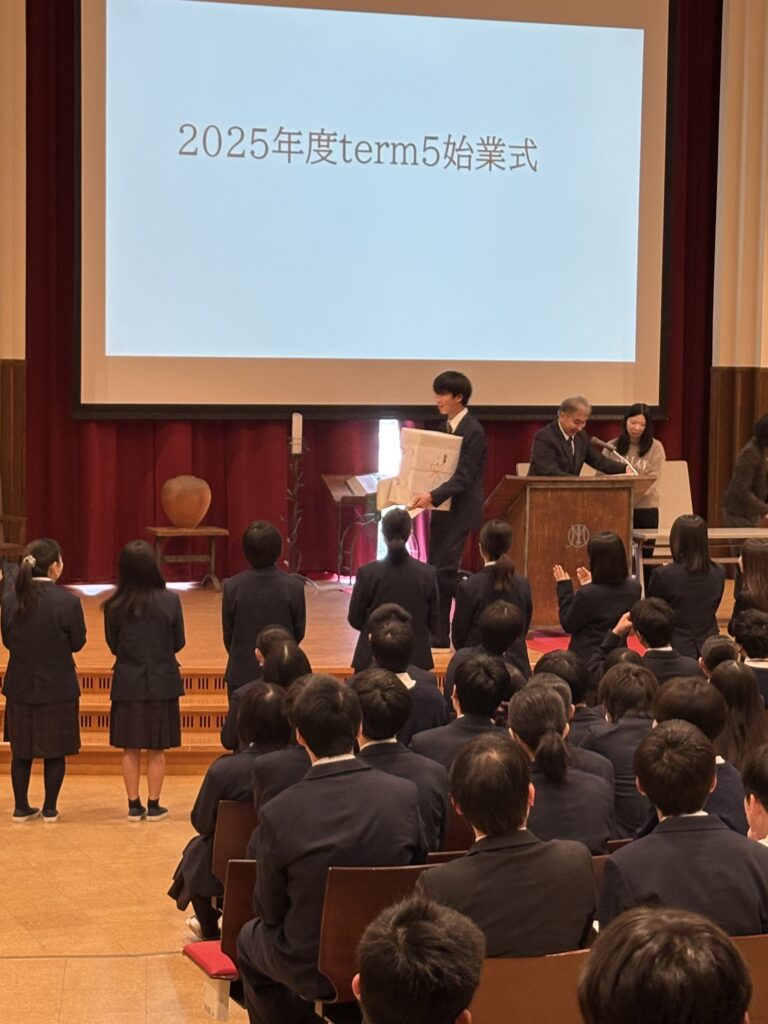 始業式後にはクラブ活動の入賞や作文コンクールの入賞など各種表彰があり、学校としてはGTECの成績向上による奨励賞をいただきました。
