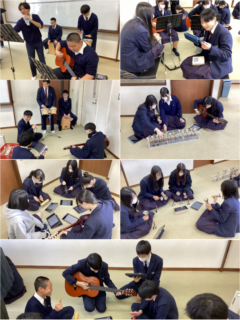 3年生の音楽は、毎年この時期にグループ発表に取り組んでいます。4名から6名のグループに分かれて、ギター、合唱、リコーダだー、打楽器、歌唱、ミュージックベルを組み合わせて各グループで練習をしてしています。練習時間が余り取れない中で、完成を目指しています。