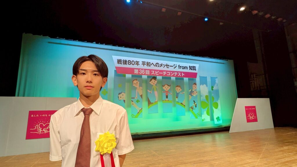 わたしは、今年の8月15日、終戦の日に開催された「平和へのメッセージ from 知覧 スピーチコンテスト」において、最優秀賞をいただきました。このコンテストは、「あした いのち かがやけ」というテーマのもと、全国の高校生が応募し、世界の恒久平和を願い、それぞれの平和への思いを発信する場です。小学生から社会人の方まで、参加者一人ひとりが自分の言葉で平和について考え、その熱い思いを伝えようとする姿が、とても印象に残りました。