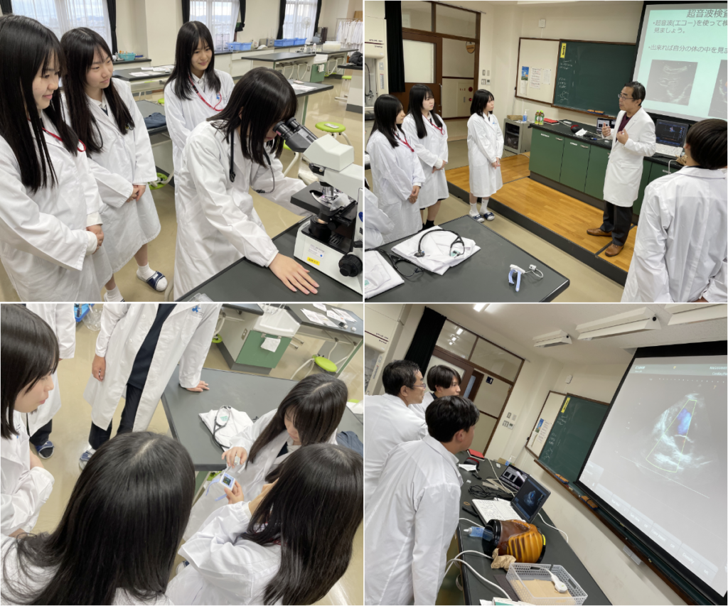 生徒たちは、赤血球や白血球を電子顕微鏡で観察したり、聴診器で自分や友だちの心音を聞いたり、エコーで自分の心臓の動きを確認したりと、実際に医療現場で使われている器具を使って貴重な体験をさせていただきました。