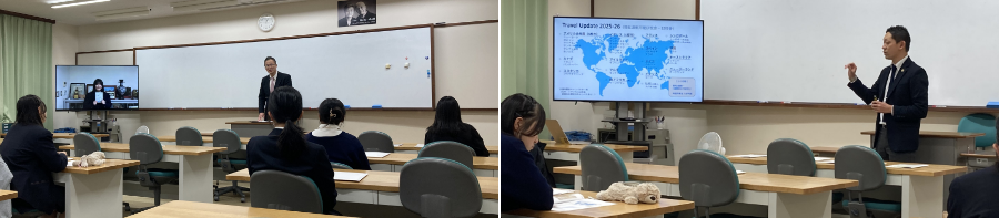 国際センター長の林先生より、トビタテ留学の魅力は、世界を舞台にした調べ学習ができること、日本中に志高い仲間ができること、自分自身大きく成長できることだとお話がありました。そして、昨年、イギリスと韓国に留学した先輩それぞれの体験談を聞いた後、EFエデュケーション・ファースト・ジャパン株式会社の留学カウンセラー、中岡様をお招きして、2026年度のプログラム説明をしていただきました。