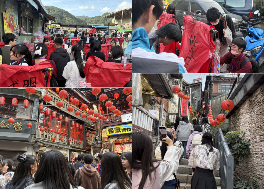 午後からは十份と九份を訪れました。十份ではランタンに自分の願いを書き、灯籠上げを行いました。線路の上から飛ばすという、日本ではできない貴重な体験ができました。その後、「千と千尋の神隠し」の舞台のモデルとも言われる九份へ行きました。活気ある雰囲気の中にも、台湾ならではの風情を全身で感じることができました。