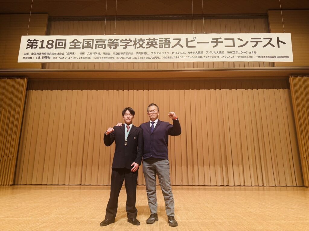 惜しくも入賞には至りませんでしたが、自身の問題意識を英語で論理的かつ情熱的に発信し、全国の舞台で堂々と意見を述べました。この経験を今後の学びや挑戦に生かしていくことが期待されます。