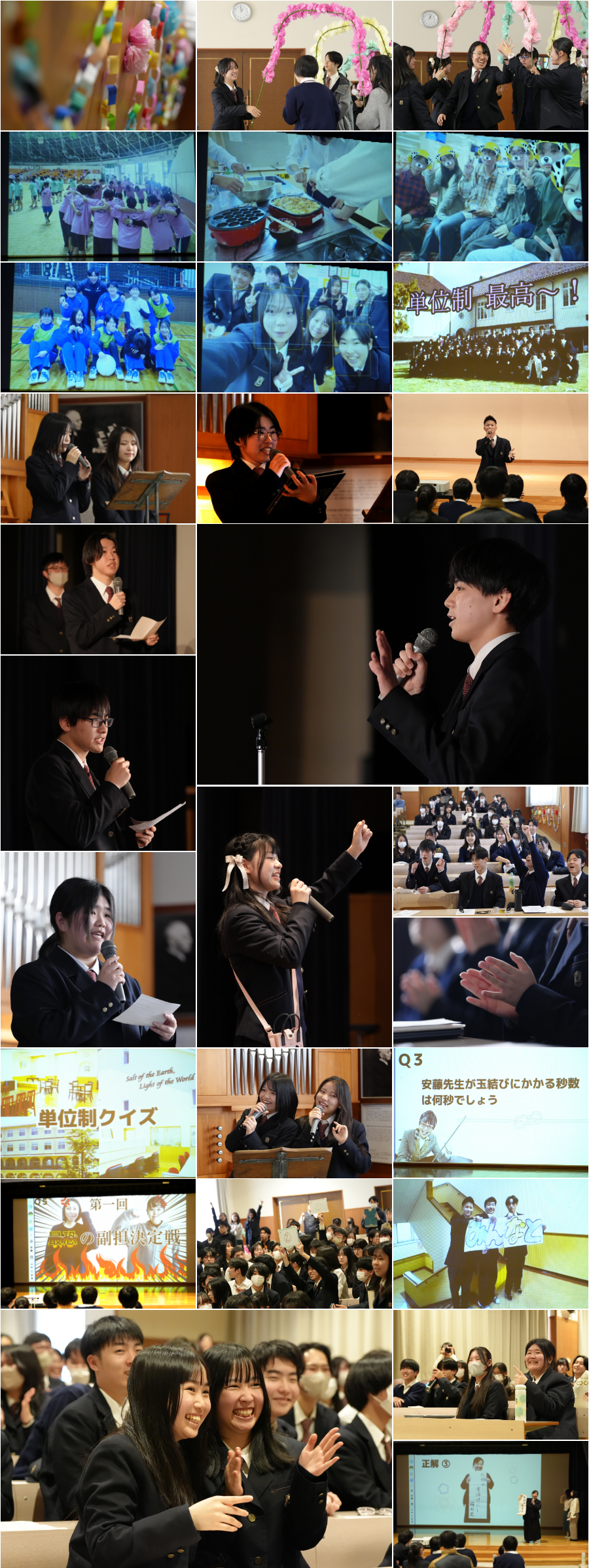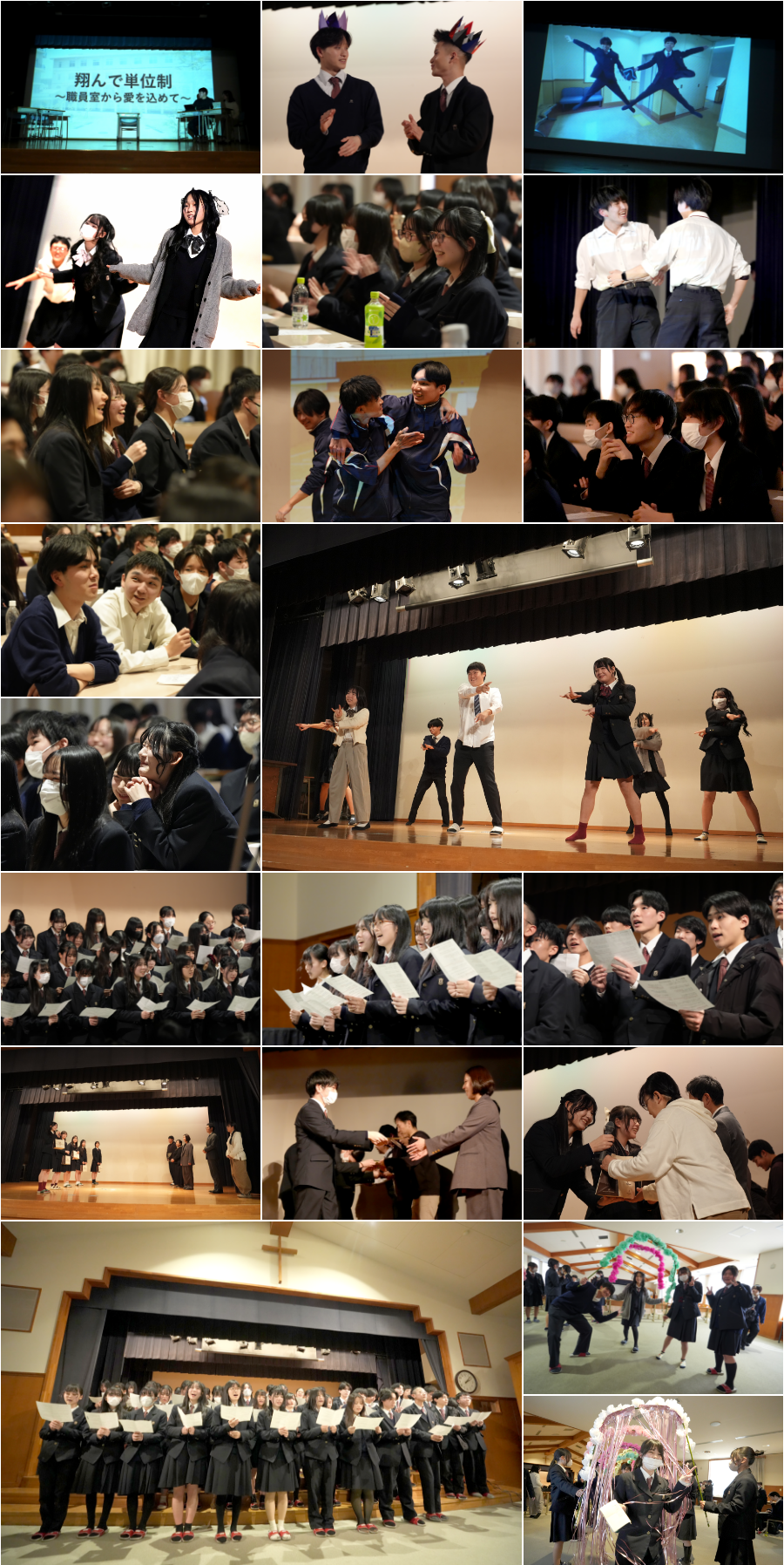 第2部では、3・4回生に感謝を込めて、各回生から創意工夫をした出し物を披露しました。1回生は動画やダンス、手作りの贈り物、2回生は創作劇や合唱「ボクノート」、教員からは単位制の良さを表現した劇、メッセージ、合唱(放課後に猛練習しました)と、それぞれの形で3.4回生への感謝を伝えました。そのお返しに3回生から単位制の先生方を題材にしたクイズや贈り物、4回生からも映像等の発表がありました。