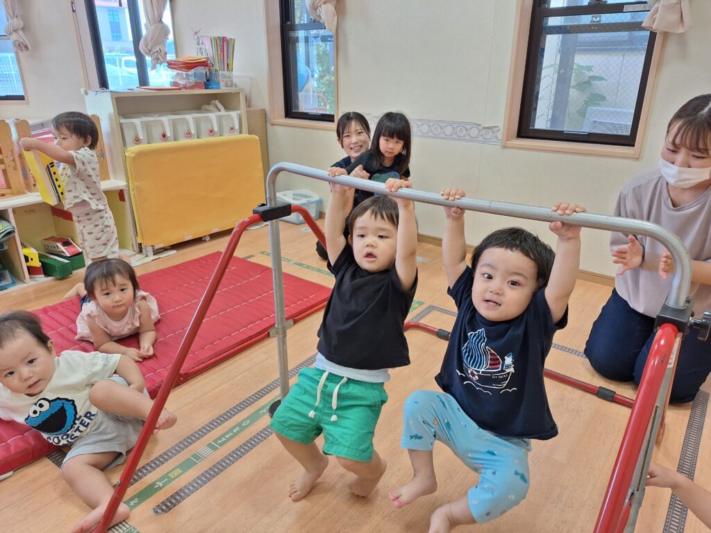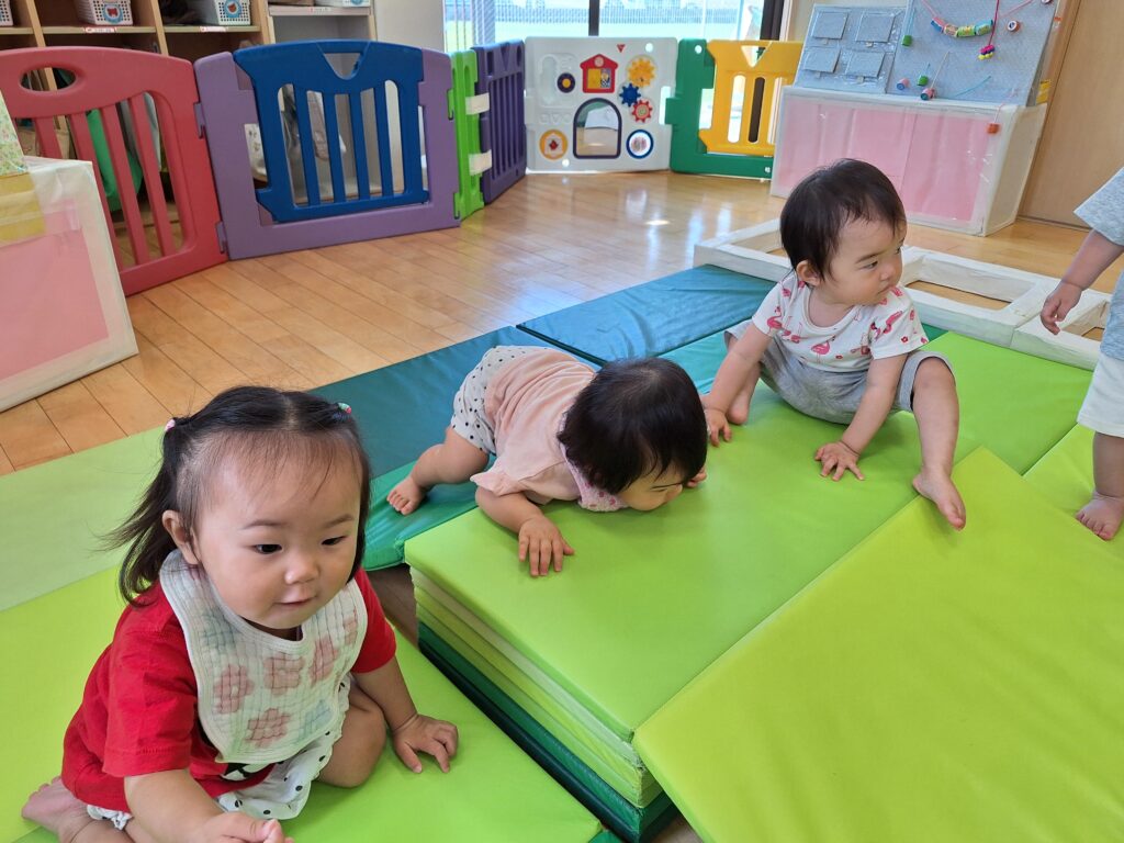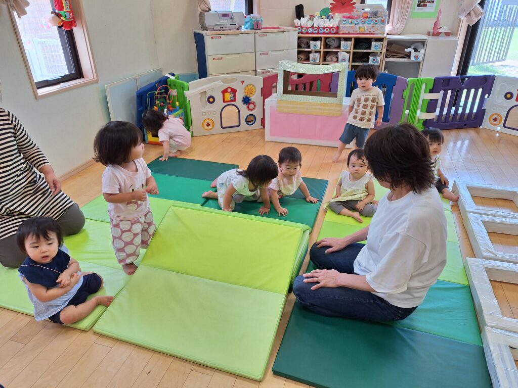 乳児クラスでは、朝の運動遊び(わくわくタイム)を楽しんでいます。
